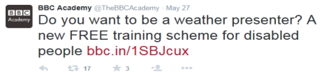 This of course is not a job advertisement so possibly the fuss is a storm in a twitter tea cup. We give young people the chance to experience work as interns. Is this all that different albeit with a different group of beneficiaries? The BBC said it is “........ not advertising for a disabled weather presenter. This three day training opportunity is open to men and women with disabilities who have a passion for weather and the environment and who have the potential to become weather presenters in the future. There are no jobs guaranteed at the end of the training. There is nothing ‘PC’ about offering training to people with disabilities.”